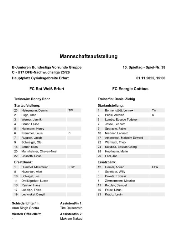 | Aufstellung FC Energie Cottbus B-Junioren |