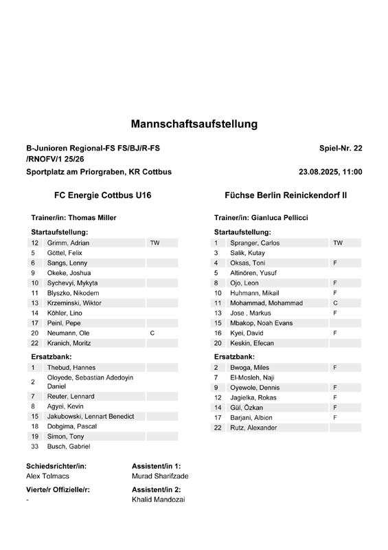A. Grimm - F. Göttel, L. Sangs, J. Okeke, M. Sychevyi, N. Blyszko, W. Krzeminski, L. Köhler, P. Peinl, O. Neumann, M. Kranich Auswechslungen: Trainer: Thomas Miller |