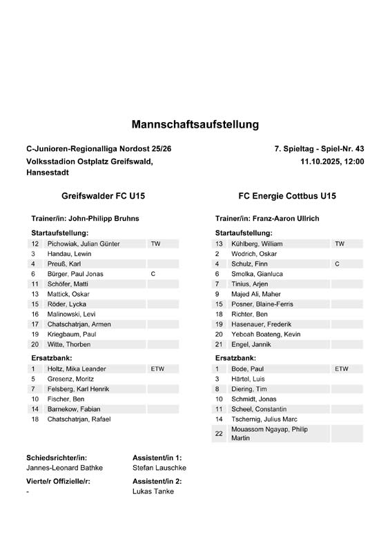 | Aufstellung FC Energie Cottbus C-Junioren |