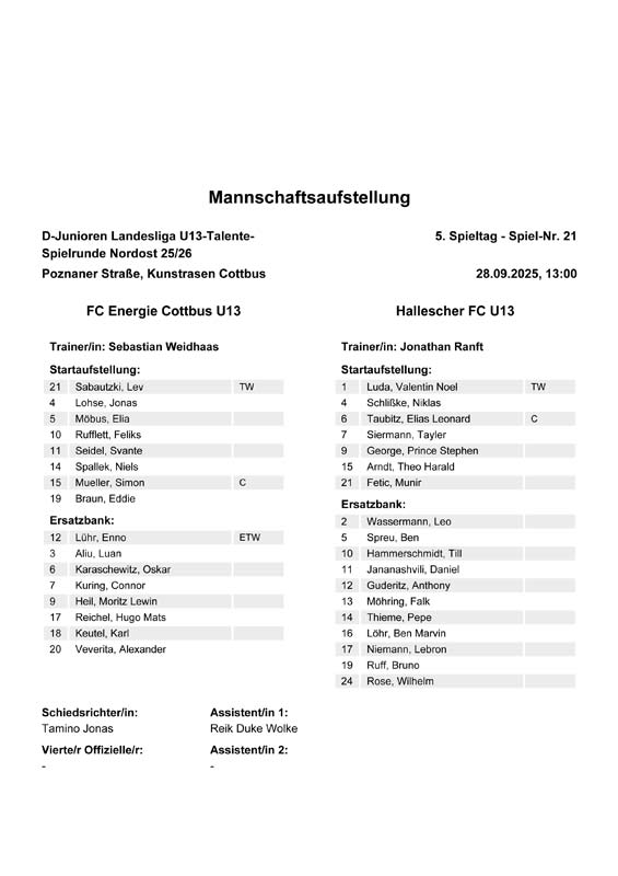 E. Lühr, L. Sabautzki - L. Aliu, J. Lohse, E. Möbus, O. Karaschewitz, C. Kuring, M. Heil, F. Rufflett, S. Seidel, N. Spallek, Si. Müller, H. Reichel, K. Keutel, E. Braun, A. Veverita Trainer: Sebastian Weidhaas |