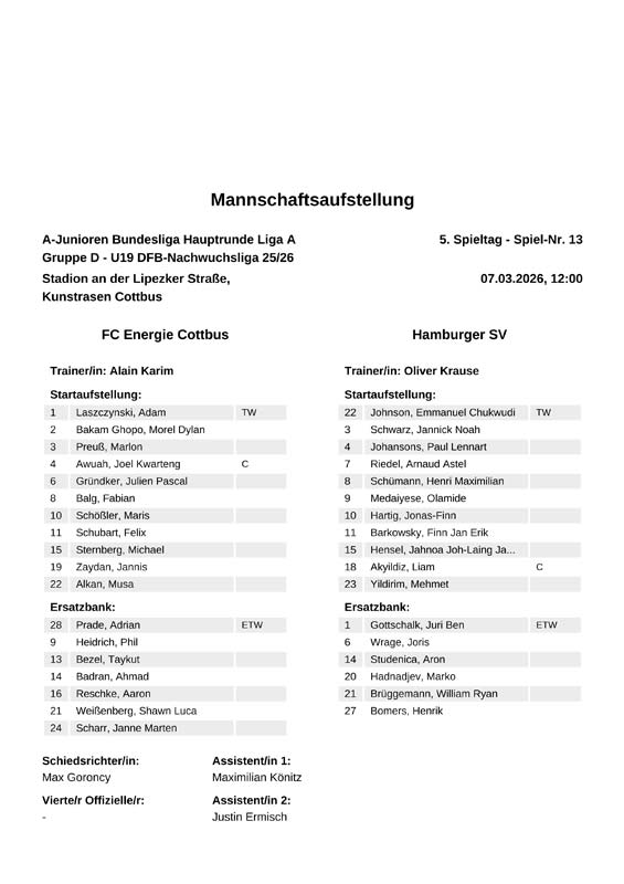 | Aufstellung FC Energie Cottbus A-Junioren |