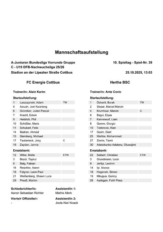| Aufstellung FC Energie Cottbus A-Junioren |