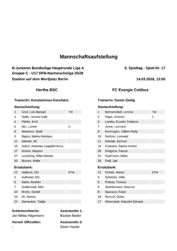 L. Bohnenstädt - A. Papic, E. Lamba, L. Jesse, G. Kenmogne, L. Nießner , S. Kotulak, D. Ciuleanu, P. Dobgima, M. Hopfmann, J. Fadl Auswechslungen: Trainer: Daniel Ziebig |