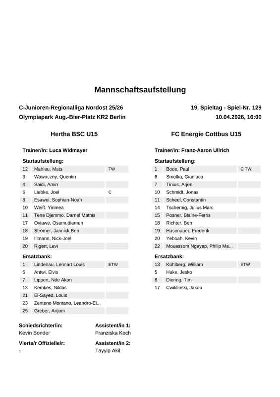 P. Bode - G. Smolka, A. Tinius, Jo. Schmidt, C. Scheel, J. Tschernig, B. Posner, Be. Richter, F. Hasenauer, K. Yeboah, P. Mouassom Ngayap Auswechslungen: Trainer: Franz-Aaron Ullrich |