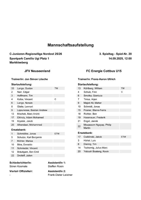 W. Kühlberg - Fi. Schulz, G. Smolka, A. Tinius, M. Majed Ali, Jo. Schmidt, B. Posner , Be. Richter, F. Hasenauer, J. Engel, P. Mouassom Ngayap Auswechslungen: Trainer: Franz-Aaron Ullrich |