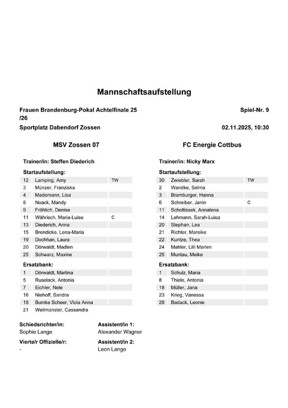 | Aufstellung FC Energie Cottbus Frauen |