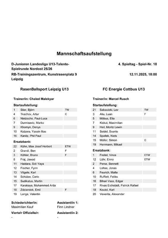 | RasenBallsport Leipzig D-Junioren | (2:0) | FC Energie Cottbus D-Junioren |