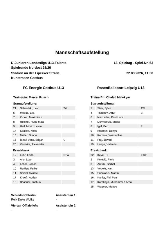 B. Stier - A. Tkachov, P. Nietzsche, M. Durmisevic, B. Igel, D. Khomyn, Y. Kutzera, J. Fraj, V. Lange Auswechslungen: Trainer: Chaled Malekyar |