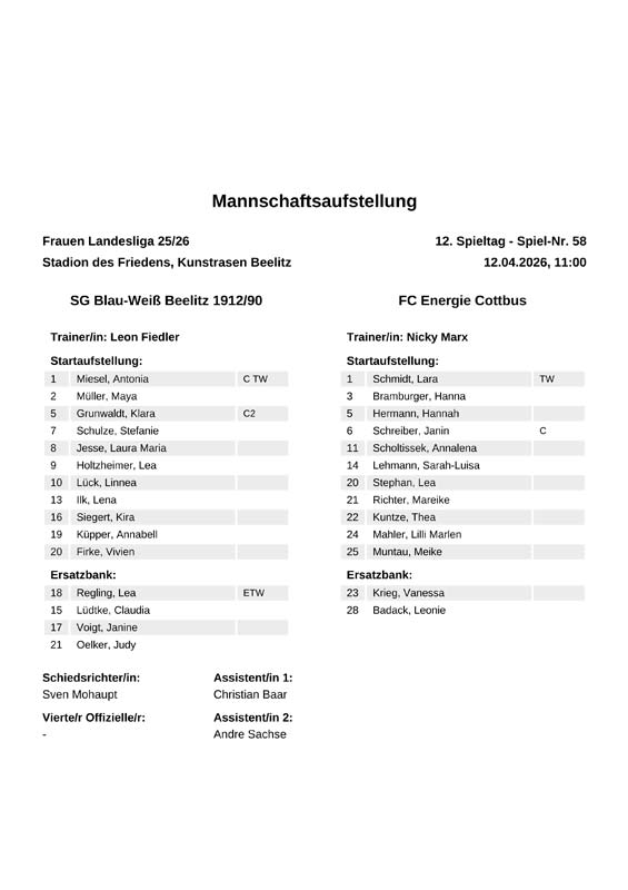 | Aufstellung SG Blau-Weiß Beelitz 1912/90 Frauen |