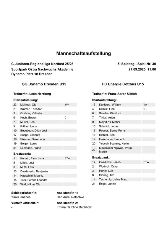 O. Möllmer - T. Kramer, V. Grabow, E. Koch, B. Müller, L. Räthel, D. Beautjean, L. Scope , S. Püschel, L. Belger, F. Lehmann Auswechslungen: Trainer: Leon Herzberg |