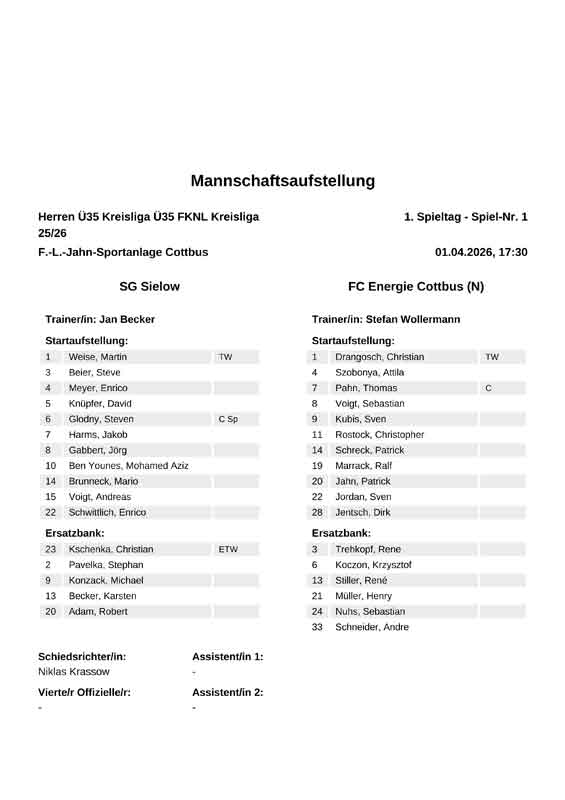 M. Weise - S. Beier, E. Meyer , D. Knüpfer, S. Glodny, J. Harms, J. Gabbert , M. Ben Younes , M. Brunneck, A. Voigt, E. Schwittlich Auswechslungen: Trainer: Jan Becker |