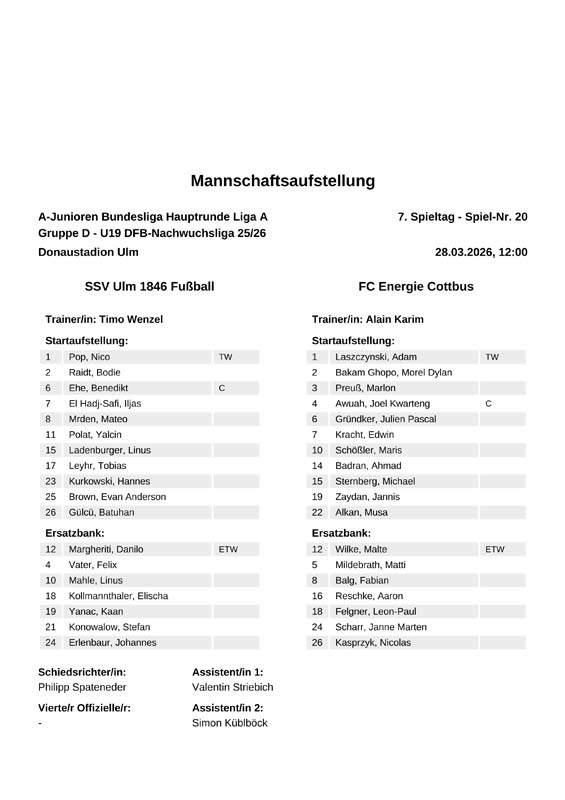 | Aufstellung SSV Ulm 1846 Fußball A-Junioren |