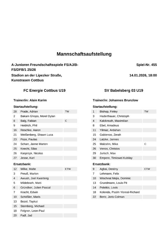 | Aufstellung FC Energie Cottbus A-Junioren |