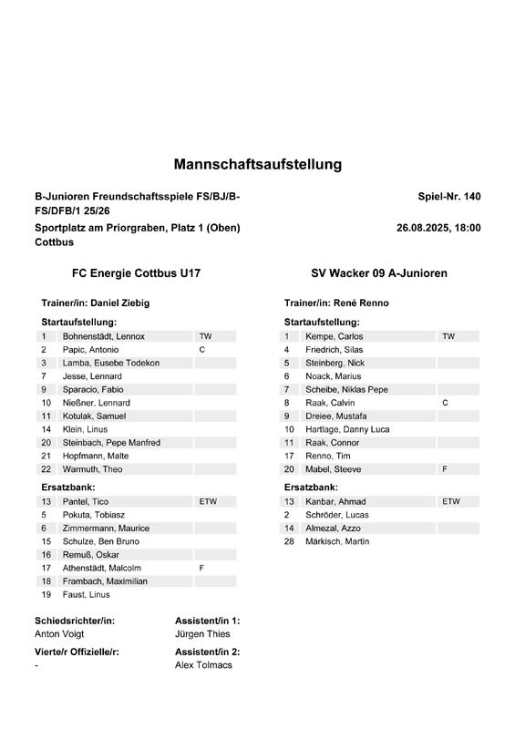 L. Bohnenstädt - A. Papic, E. Lamba, L. Jesse , F. Sparacio, L. Nießner, S. Kotulak, L. Klein, P. Steinbach, M. Hopfmann, T. Warmuth Auswechslungen: Trainer: Daniel Ziebig |