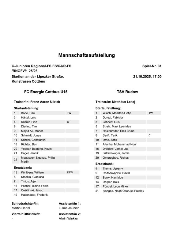 | Aufstellung FC Energie Cottbus C-Junioren |