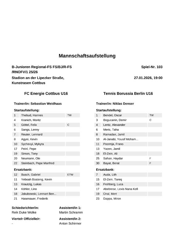 H. Thebud - M. Kranich, F. Göttel, L. Sangs, L. Reuter, K. Agyei, M. Sychevyi, P. Peinl, T. Simon, O. Neumann , P. Steinbach Auswechslungen: Trainer: Sebastian Weidhaas |