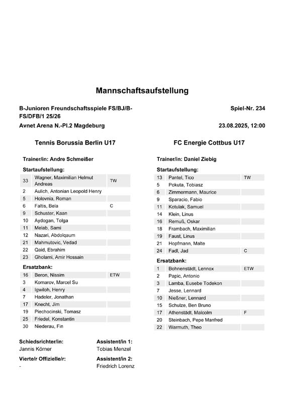 T. Pantel - T. Pokuta, Mau. Zimmermann, F. Sparacio, S. Kotulak, L. Klein, O. Remuß, M. Frambach, L. Faust, M. Hopfmann, J. Fadl Auswechslungen: Trainer: Daniel Ziebig |