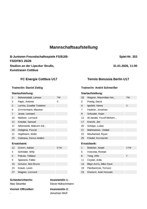 | Aufstellung FC Energie Cottbus B-Junioren |