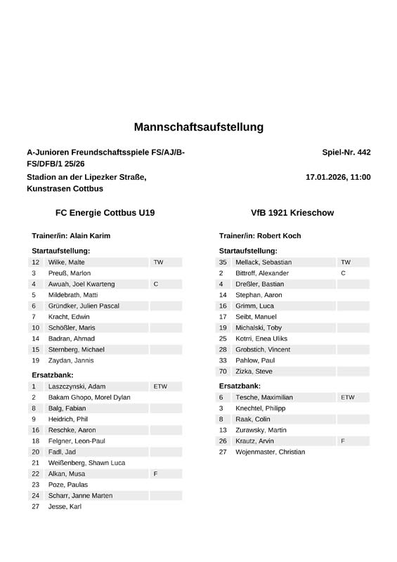 | Aufstellung FC Energie Cottbus A-Junioren |