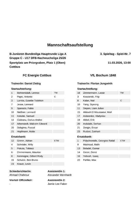 L. Bohnenstädt - A. Papic, E. Lamba , L. Jesse, F. Sparacio, L. Nießner, S. Kotulak, D. Ciuleanu, M. Athenstedt, P. Dobgima, M. Hopfmann Auswechslungen: Trainer: Daniel Ziebig |