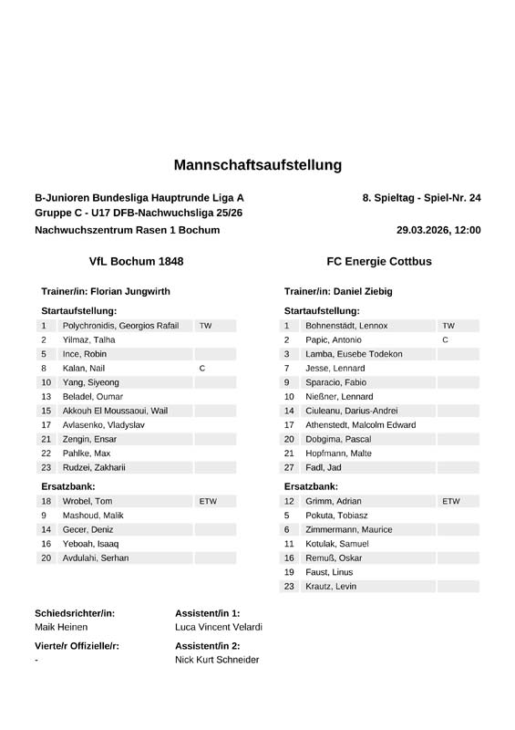L. Bohnenstädt - A. Papic, E. Lamba, L. Jesse, F. Sparacio, L. Nießner, D. Ciuleanu, M. Athenstedt, P. Dobgima, M. Hopfmann, J. Fadl Auswechslungen: Trainer: Daniel Ziebig |
