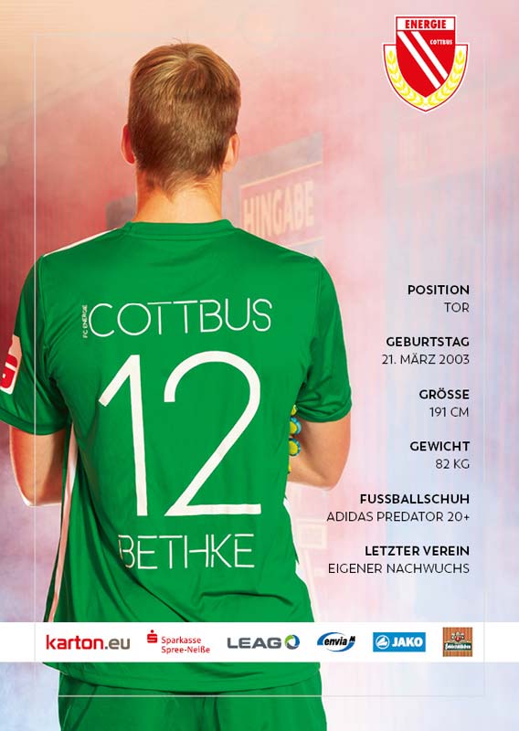 Als sich im April 2022 die etatmäßige Nummer eins Toni Stahl mit muskulären Problemen abmelden musste, kam die Chance für Elias Bethke. In seinem ersten Spiel am 14. April 2022 gewann er im Kasten von Energie gegen Tasmania Berlin mit 5:0. Und auch das Spiel darauf stand er beim 1:1 gegen Lok Leipzig im Tor unserer Mannschaft. Diese beiden Saisoneinsätze bei den Männern zeigten bereits, welches Potenzial der damals 19-jährige mitbrachte. Nachdem Toni Stahl die Lausitz im Sommer verließ, machte Pele Wollitz seinen Nachwuchskeeper zur neuen Nummer eins. Mit Bethke kassierte Energie in der Saison 2022/23 nur 28 Gegentore - die zweitwenigsten der Liga - und wurde Meister der Regionalliga Nordost. Lediglich das Scheitern in den Aufstiegsspielen gegen Unterhaching trübte die sonst sehr starke Saison des Torhüters.