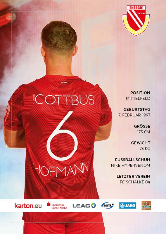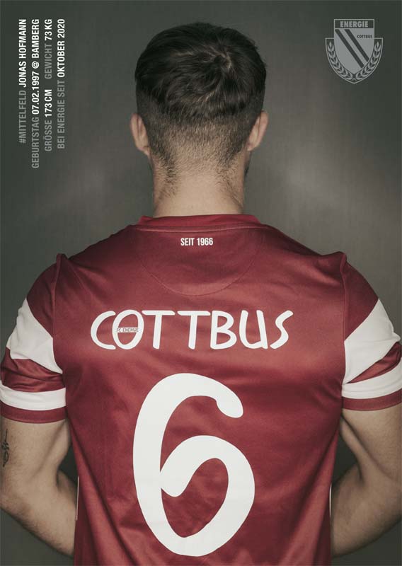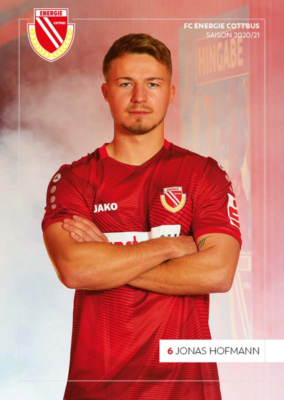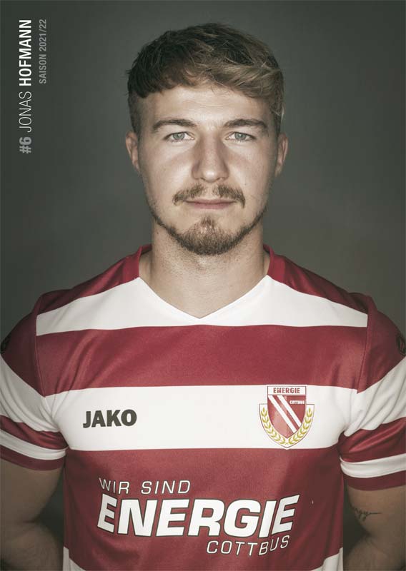 Dass Jonas inzwischen kaum noch wegzudenken ist, merkt man besonders dann, wenn er mal verletzungsbedingt nicht auf dem Platz steht. Jonas Hofmann ist Dreh- und Angelpunkt unserer Mannschaft, ist ein Arbeiter und Kämpfer, der im Mittelfeld die Fäden zieht. Ausgebildet beim 1. FC Nürnberg, kam er über die Sportfreunde Lotte und Schalke 04 im Oktober 2020 nach Cottbus. Sein Debüt feierte der Sechser beim 3:2-Pokalsieg in Krieschow, sein erstes Tor folgte nur einen Monat später zum 1:1 gegen den FSv Luckenwalde. 2021/22 wurde er endgültig Stammspieler und dank seines immerzu vorbildlichen Einsatzes auch Führungsspieler beim FCE. Die Fans schlossen ihren "Hofi" schnell ins Herz und auch Jonas selbst fühlt sich in Cottbus merklich wohl.