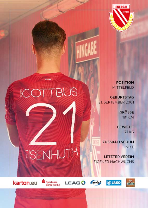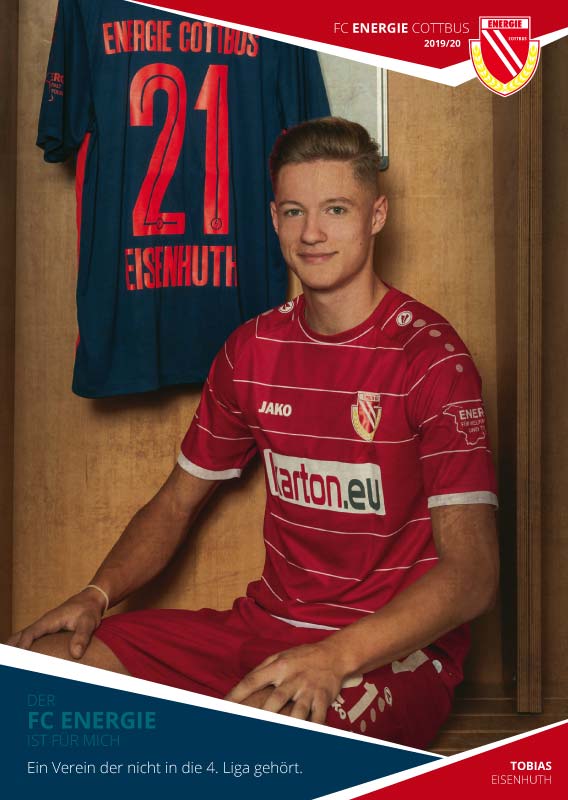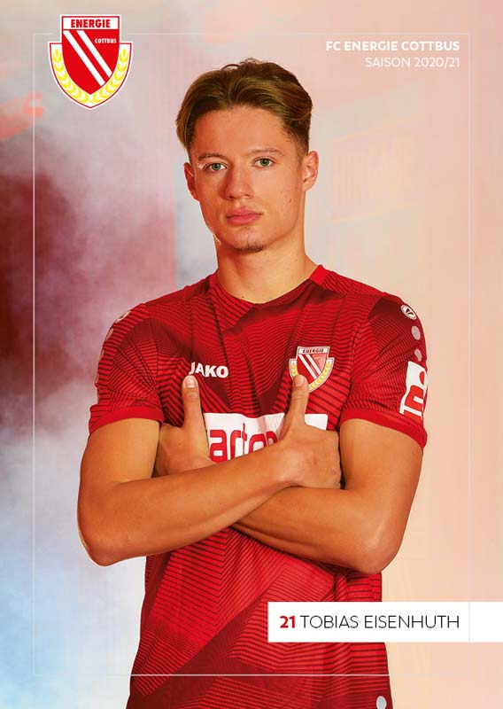Tobias Eisenhuth kam 2014 aus Frankfurt (Oder) ans NWLZ nach Cottbus. Beim FCE spielte er anfangs für die C-Jugend, ab 2016 für die B-Junioren, mit denen er sogleich den Staffelsieg in der Regionalliga schaffte, und dabei die starken Nachwuchsteams von Chemnitz und RB Leipzig hinter sich ließ. Nach dem Aufstieg in die B-Junioren-Bundesliga spielte Eisenhuth an der Seite von Kevin Schade und Co eine gute Runde und platzierte sich mit dem FCE im Mittelfeld. Das Mittelfeld war ohnehin Eisenhuths Stärke, wenngleich er auch in der Defensive hin und wieder zum Einsatz kam. Nach 26 Spielen in der B-Junioren-Bundesliga folgten 2018/19 26 Spiele für die A-Junioren in der Regionalliga, wo er gemeinsam mit Niklas Geisler und Moritz Broschinski spielte und sogar fünf Tore erzielte. Natürlich wurde er auch mit der U19 Staffelmeister und stieg abermals in die Bundesliga auf.