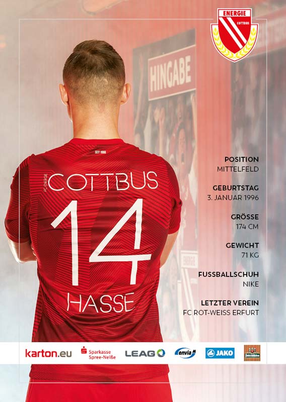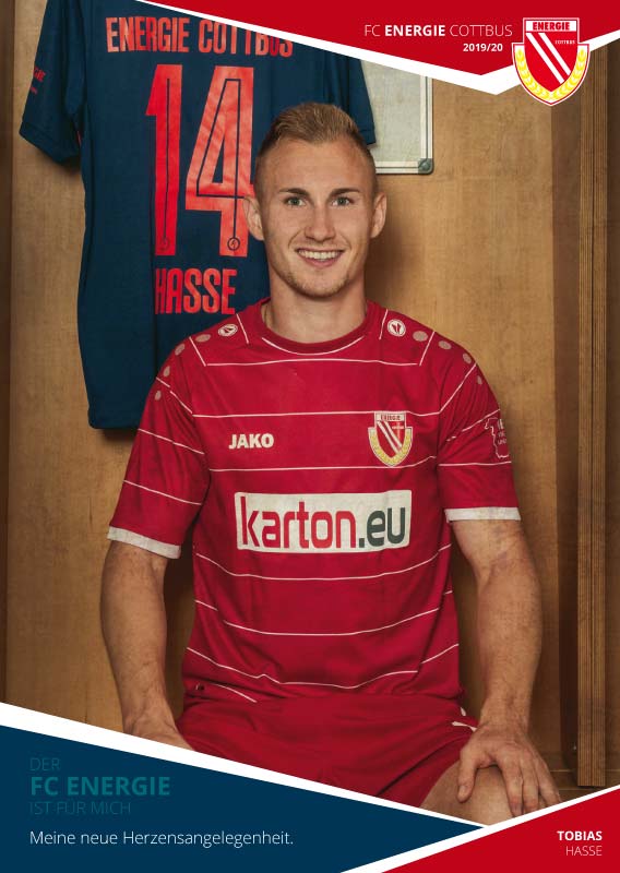 Nachdem Energie 2019 aus der dritten Liga abstieg, musste Pele Wollitz auch wieder einen neuen Kader aufbauen. Auf seiner Wunschliste stand auch der inzwischen mit reichlich Regionalliga-Erfahrung ausgestattet Tobias Hasse. Und er startete furios in die Saison. Als Rechtsverteidiger war er anfangs auch im Energie-Kader gesetzt und startete mit Heimsiegen gegen Altglienicke (3:1) und gegen Ex-Klub Rot Weiß Erfurt (5:3) in die Saison. Das eigentliche Saison-Highlight war allerdings das DFB-Pokalspiel gegen die Bayern, wo Hasse 90 Minuten durchspielte und mit einem achtbaren 1:3 auch den wohlverdienten Applaus vor ausverkauftem Haus bekam. Adduktorenprobleme und eine notwendige Knie-OP sorgten jedoch dafür, dass Hasse bei nur acht Saisoneinsätzen blieb.
