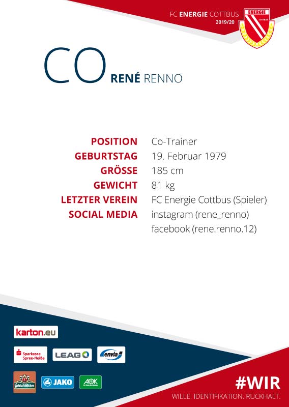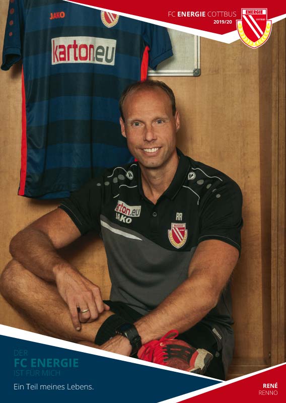 René Renno kam 2010 als zweiter Keeper zusammen mit Thorsten Kirschbaum nach Cottbus und nahm die Rolle des Ersatztorwarts sportlich und professionell an. Auch den Nachfolgern Robert Almer, Kevin Müller und Daniel Lück begegnete er im fairen Konkurrenzkampf und konnte entsprechend auch über 50 Einsätze für Energie bestreiten. Zwei Abstiege musste der sympathische und stets freundliche Torhüter zwar mit unserem Verein erleben, stand allerdings auf Grund seiner professionellen Einstellung und den gezeigten Leistungen stets hoch in der Gunst der Anhängerschaft, die ihn 2015 zum Energie-Fußballer des Jahres wählte. 2016 wechselte Renno in eine ehrenamtliche Beraterfunktion und ist seit 2018 festes Mitglied im Trainerteam von Claus-Dieter Wollitz.